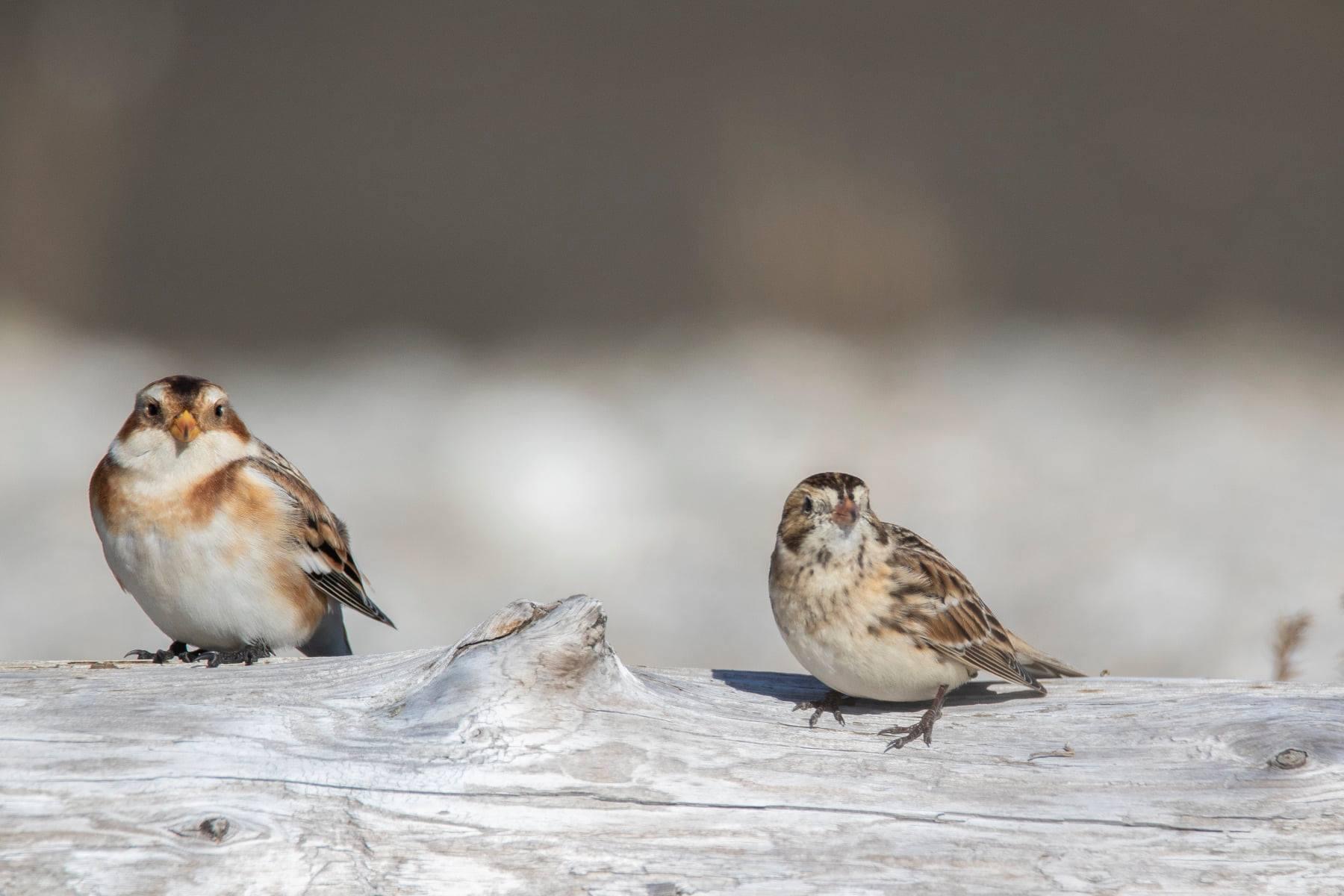 A Snow Bunting, left, with a Lapland Longspur. The species are often found together on beaches in winter in the estuarine research reserve. Photo by Christina Cole.